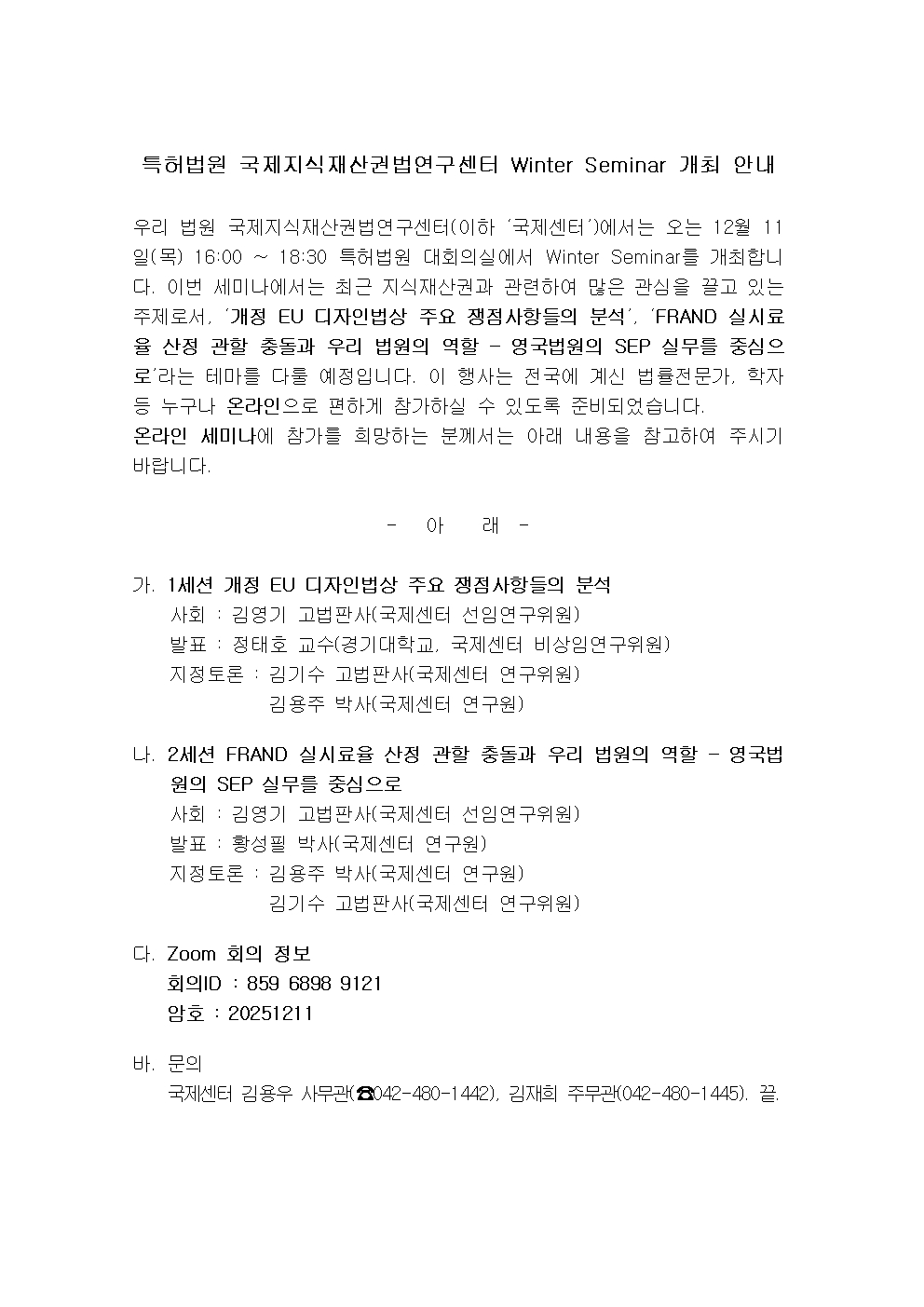 | Á¦¸ñ | ƯÇã¹ý¿ø ±¹Á¦Áö½ÄÀç»ê±Ç¹ý¿¬±¸¼¾ÅÍ Winter Seminar °³ÃÖ ¾È³» | ||||
